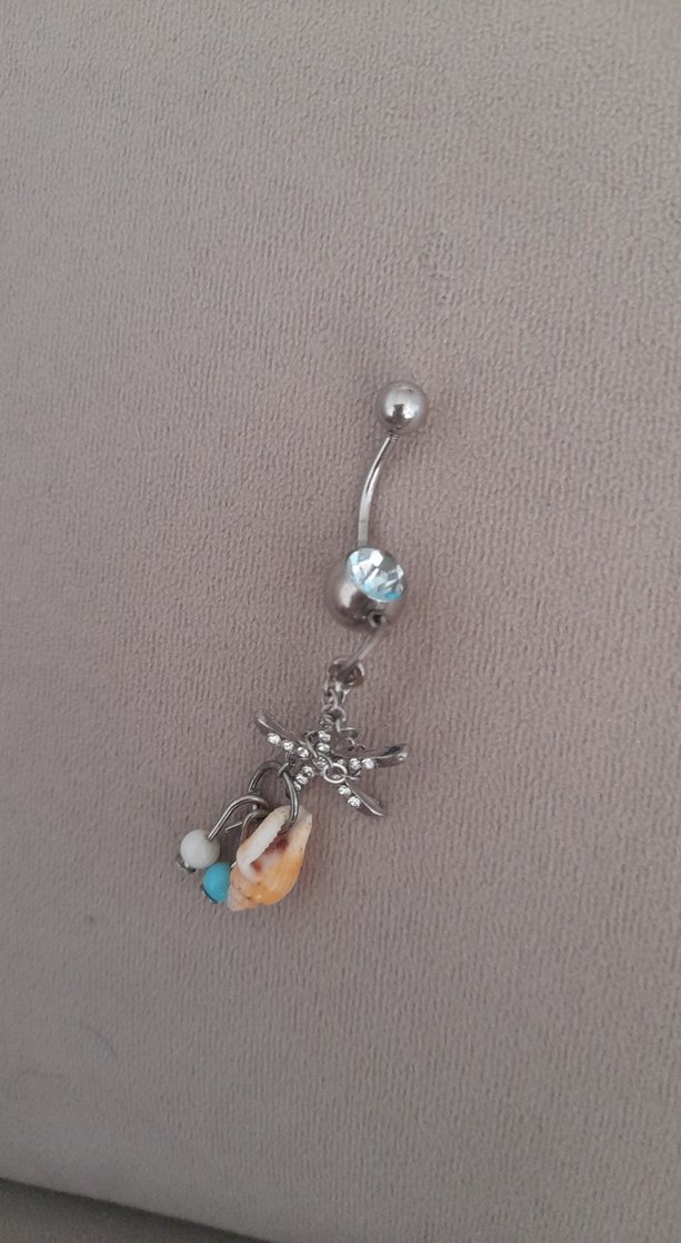 Bohem tarzda, boncuklu turkuaz süslemeli ve denizyıldızı figürlü göbek piercingi, retro görünüm için uygun.