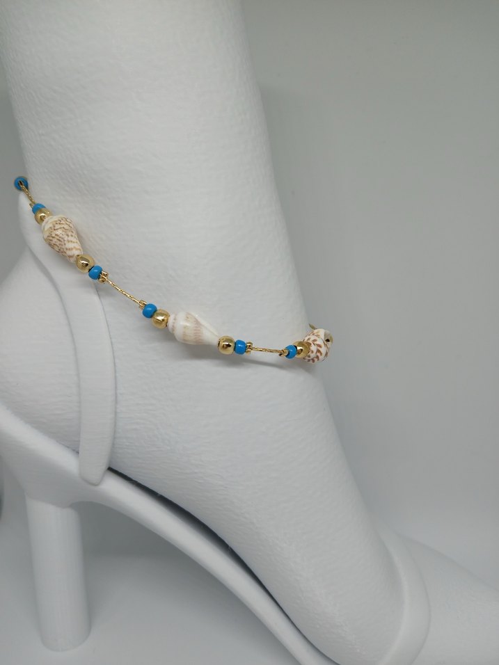 Turkuaz boncuklar ve doğal deniz kabuğu detayları ile boncuklu, minimalist bohem tarzda halhal, günlük kullanım için uygun.