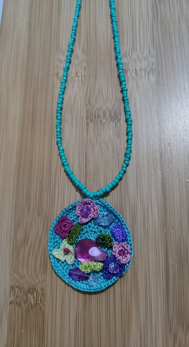 Turkuaz örgü üzeri renkli çiçek nakışlı kolye ucu ile bohem tarzını yansıtan kolye. Yeni kullanilmadı