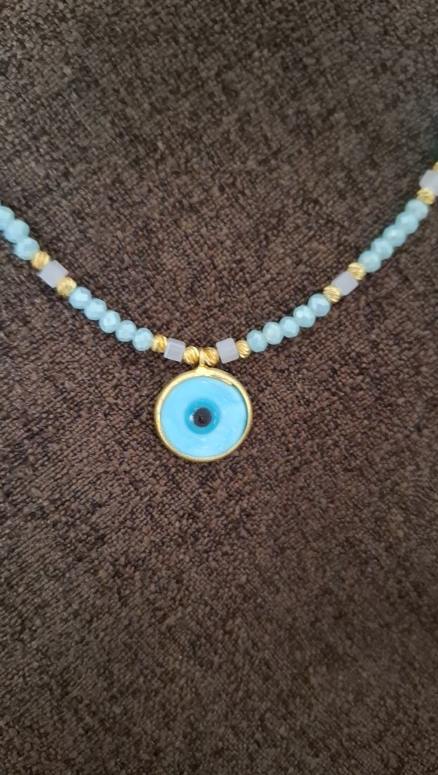 Kısa uzunlukta, boncuklu ve turkuaz renkte bohem tarzı mini kolye. Nakış desenli ve günlük kullanıma uygun bir aksesuar.