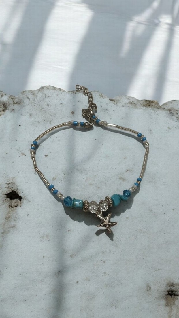 Boncuklu ve turkuaz taşlı, deniz yıldızı figürlü bohem tarzda halhal. Renkli ve retro görünümüyle plajda kullanıma uygun. ÜRÜN YURT DISINDAN GELDİ SIFIR HİÇ KULLANILMADI