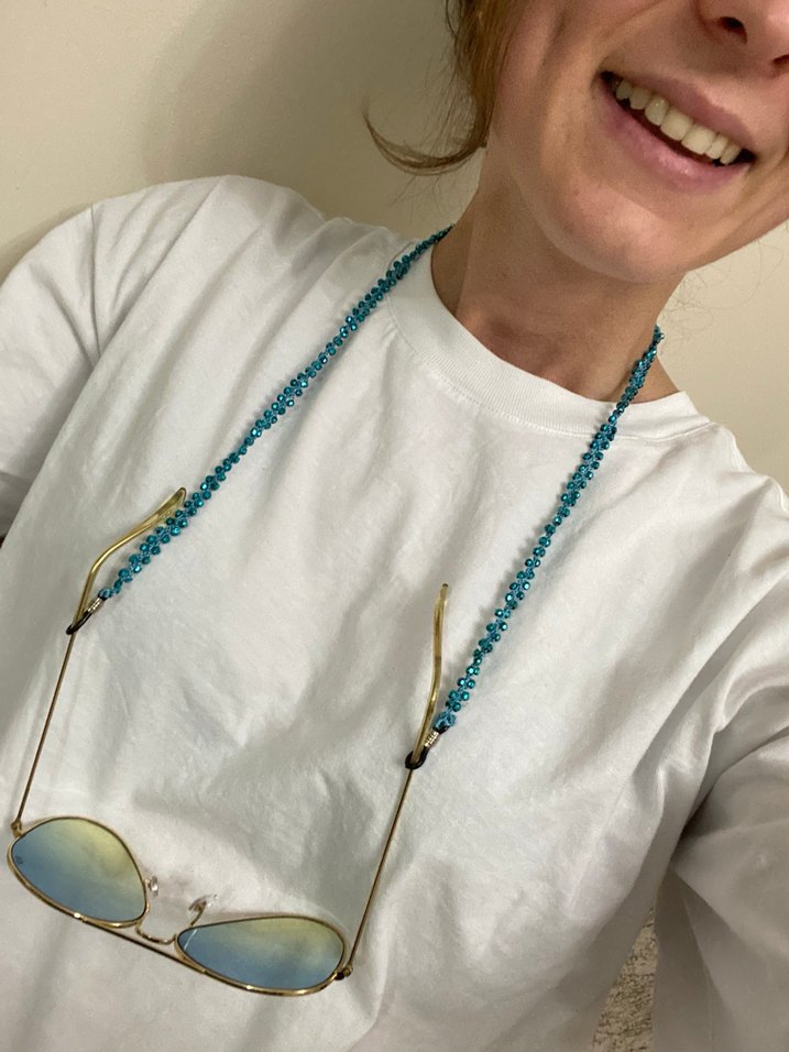 Parlak turkuaz boncuklardan yapılmış, bohem tarzına uygun gözlük zinciri. Gözlüklerinize renkli ve kullanışlı bir detay katıyor.60 cm. İstenilen rengi önce mesaj atınız.