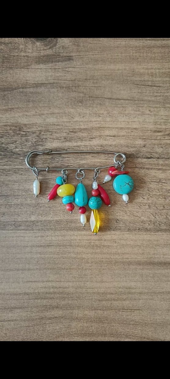Turkuaz, inci ve kırmızı mercanlarla etnik desenli, rengarenk broş, günlük bohem tarz için uygun. Hediye kutusunda gönderilecek