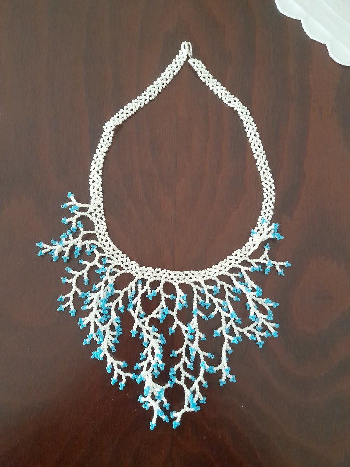Uzun uzunlukta, turkuaz boncuklarla işlenmiş nakışlı desenlere sahip bohem tarzda kolye, günlük kullanıma uygundur.