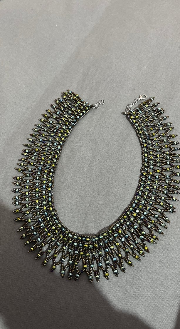 Boncuklu detaylara sahip, renkli desenli uzun kolye. Bohem ve ışıltılı tarzı yansıtan gri tonlarıyla günlük kullanıma uygun.