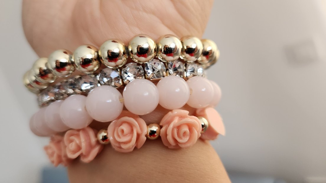Bohem tarzda, pastel pembe boncuklar ve çiçek desenleriyle tasarlanmış, altın renkli ve kristal detaylı 4lü bileklik seti. Hiç kullanılmadı.