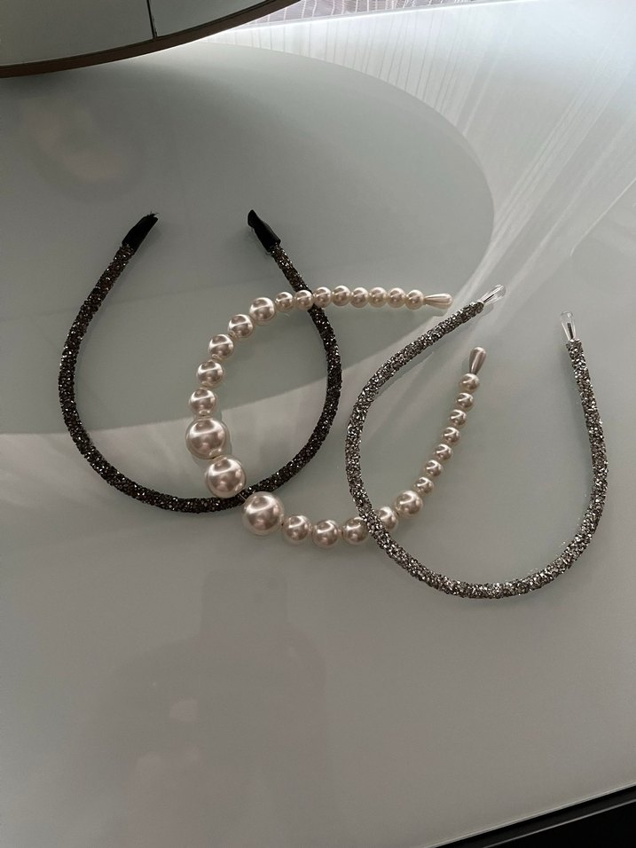 Gri ve beyaz tonlarda, boncuklu ve metal detaylı üç kadın saç aksesuarı, glamor ve gotik tarzı yansıtıyor. Marka öneçıkması için seçilmiştir