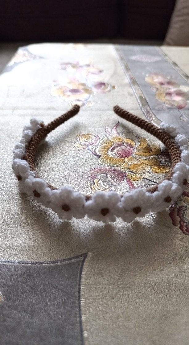 Bohem tarzda, boncuklu beyaz çiçeklerle renkli nakış detayları olan çocuk saç bandı, retro ve hippie görünüm sağlar.
