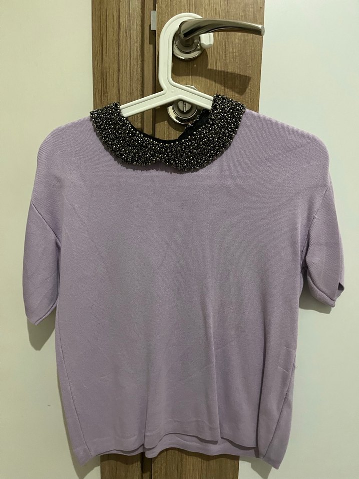 Mor renkte, boncuk detaylı yuvarlak yaka ve kısa kollu, rahat kesimli triko bluz. Günlük kullanım için uygun, sokak stiline uyumlu.