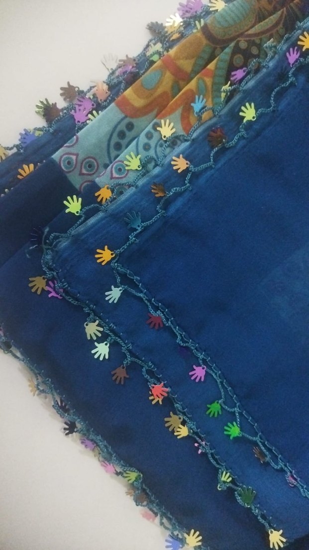 Renkli boncuklu kenarları ve küçük el şekilli detayları olan, yumuşak tekstil kumaştan bohem kadın fularıdır.