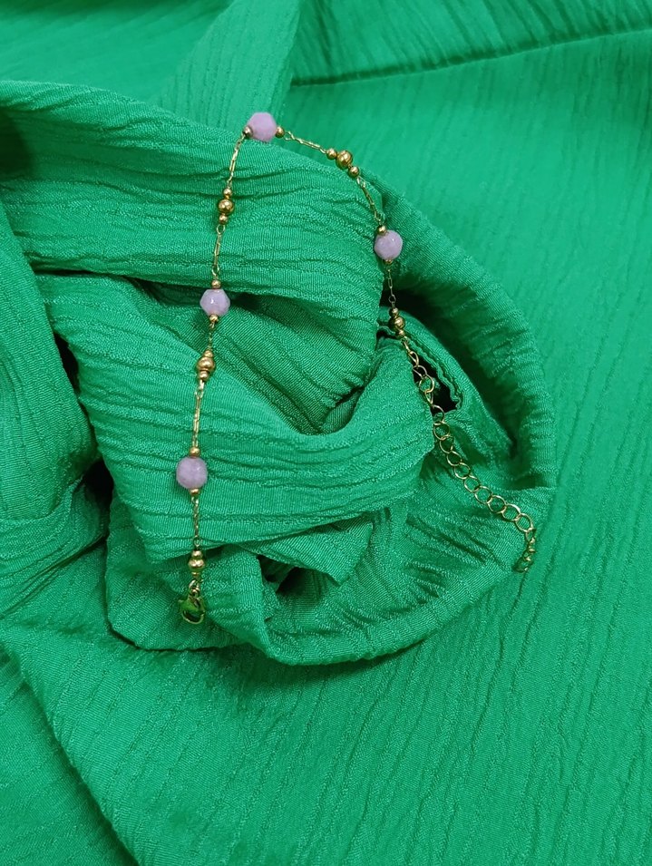 Pastel yeşil boncuklu, altın tonlu zincirden oluşan bohem tarzda kadın el zinciri, rahat ve retro bir görünüm sunar.
