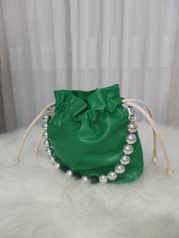 Parlak yeşil deri çanta, boncuk detaylarıyla bohem tarzı yansıtıyor, günlük kullanıma uygun.