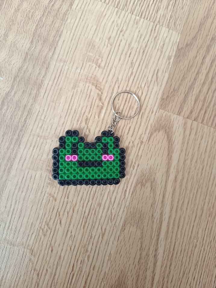 Boncuklardan yapılmış, yeşil kurbağa şekilli renkli anahtarlık, minimalist rock punk tarzına uygun.