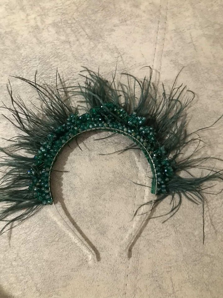 Sentetik kumaştan yapılmış, boncuk detaylı ve koyu yeşil tüylü bohem saç aksesuarı.