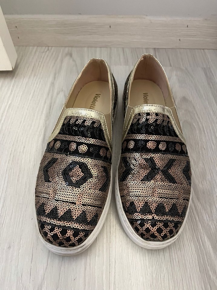 Kahverengi dolgu topuklu spor ayakkabı, yılan desenli ve boncuk işlemeli, günlük kullanım için bohem tarzda.