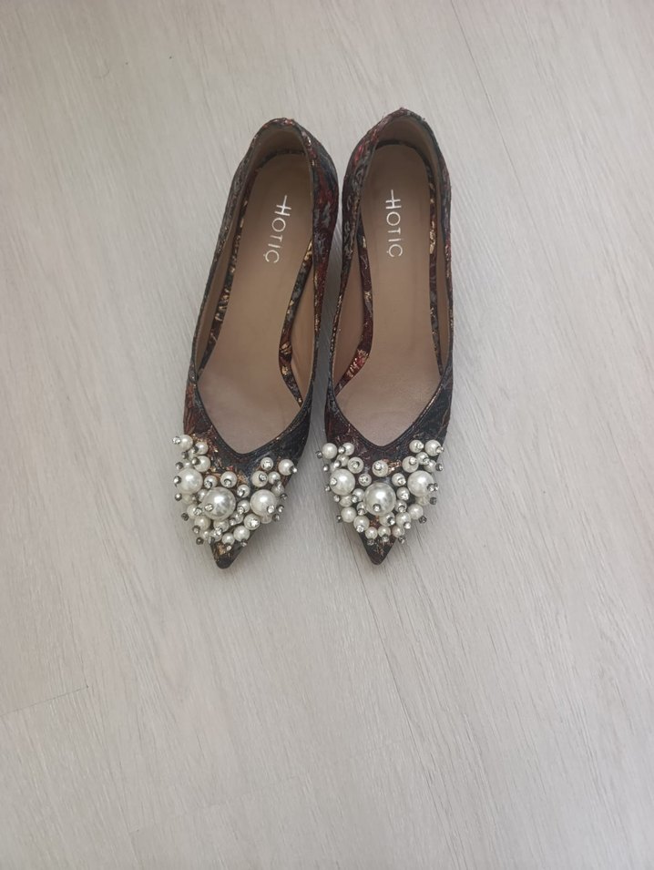 HOTIC markalı, kahverengi yılan desenli, boncuk detaylı sivri burunlu dolgu topuklu ayakkabılar. Lastik malzemeden üretilmiş, düğünler için modern ve şık.