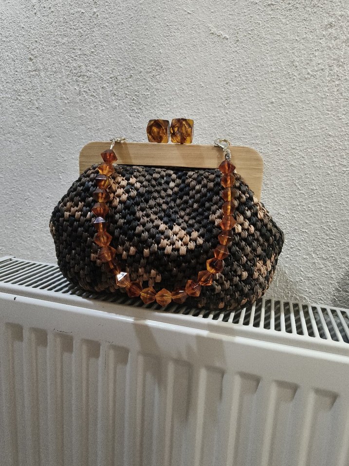 Kahverengi örgü malzemeden yapılmış, yılan desenli ve boncuk detaylı kadın çantasıdır. Vintage bohem tarzıyla günlük kullanıma uygundur.