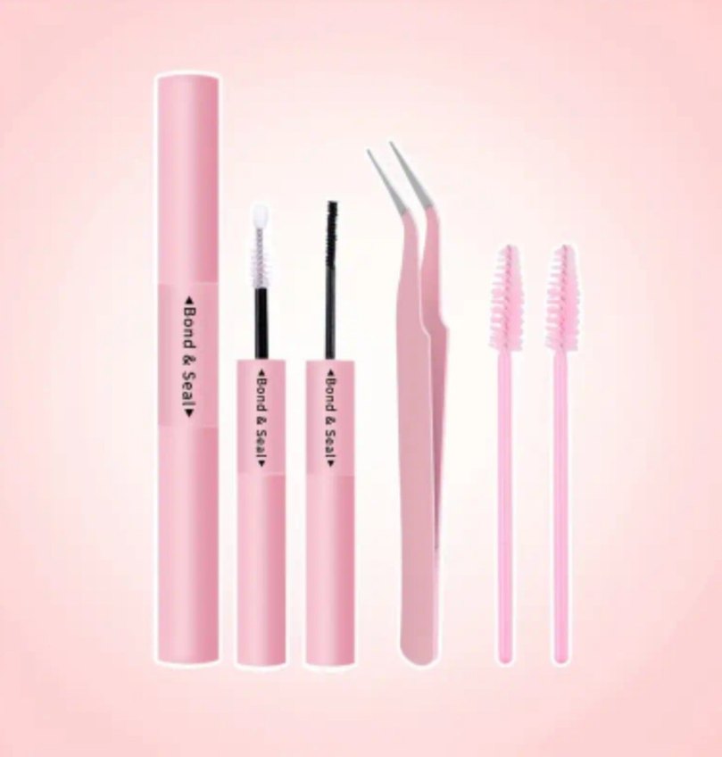Bond&Seal pembe renkli, kirpik bakım seti; cımbız, fırçalar ve aplikatörler içerir. ️