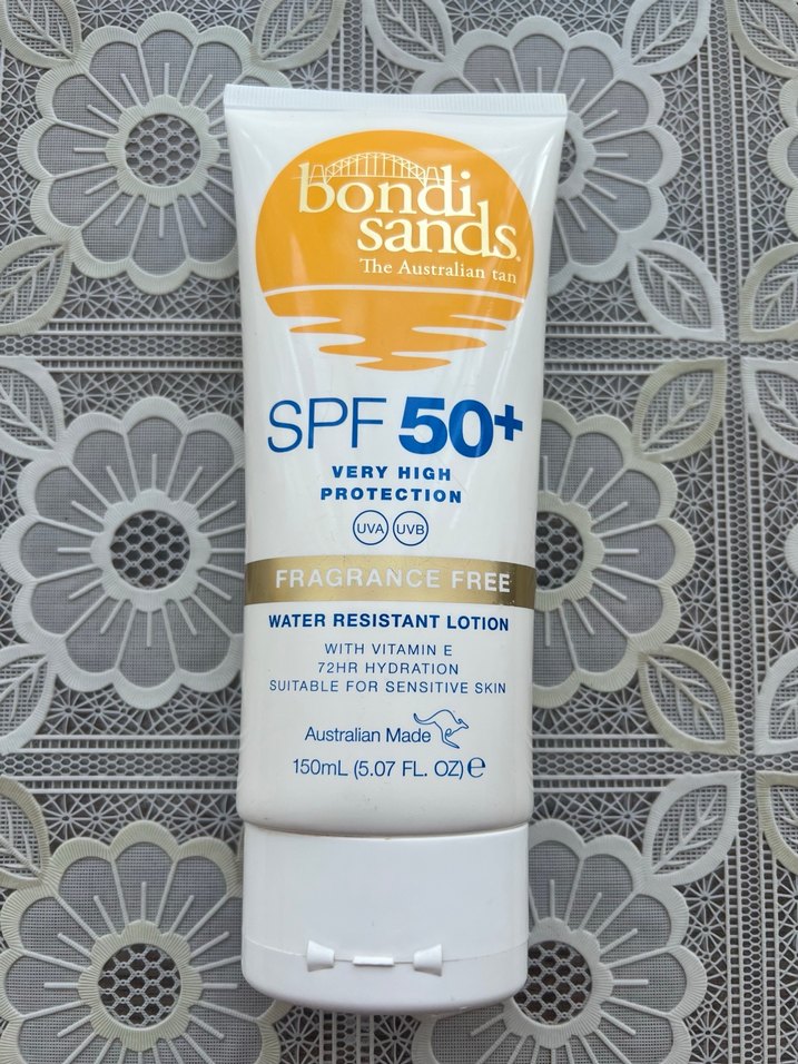 Bondi Sands SPF 50+ suya dayanıklı losyon, vitamin E ve 72 saat nemlendirme sağlar. Kokusu yoktur ve hassas ciltler için uygundur. Avustralya yapımı. ☀️Yarısından çok fazlası duruyor. Yüz ve vücuda uygundur.