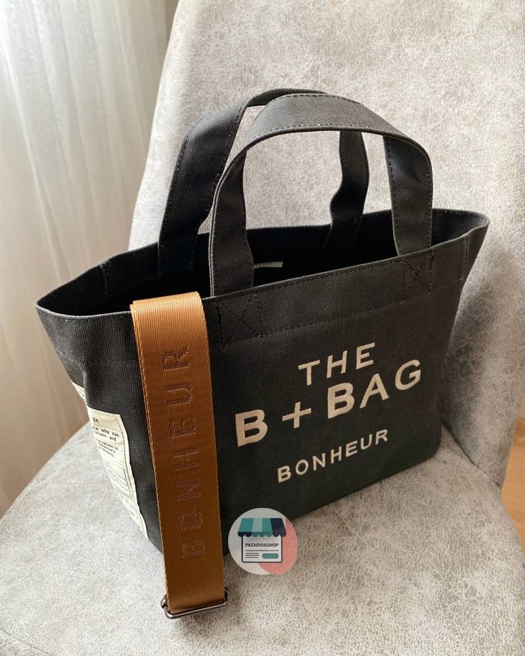 askılı kadın çantası. Üzerinde 'THE BONHEUR B+BAG' yazısı bulunur. Trendy ve günlük kullanıma uygun.