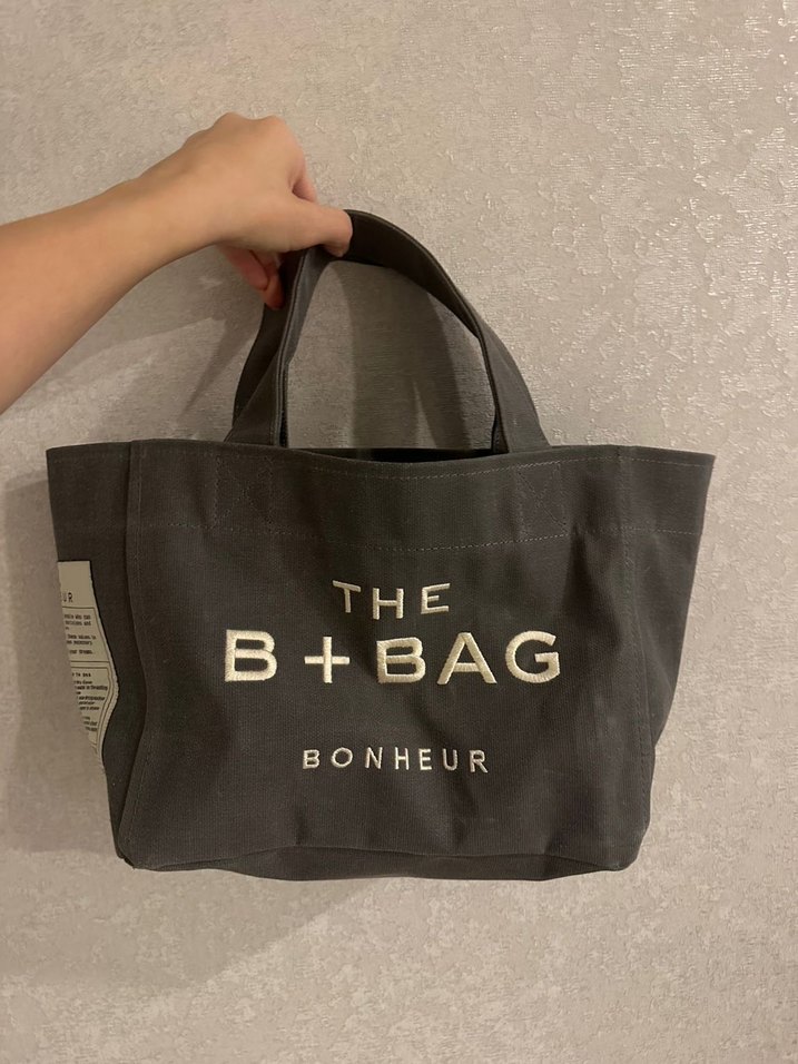 Gri baskılı, tokalı saplara sahip sentetik kumaştan yapılmış günlük kadın çantası. Üzerinde 'THE B+BAG BONHEUR' yazısı bulunur, trend gündelik stile uygundur. Askısı ile birlikte satıyorum. Az kullandım.