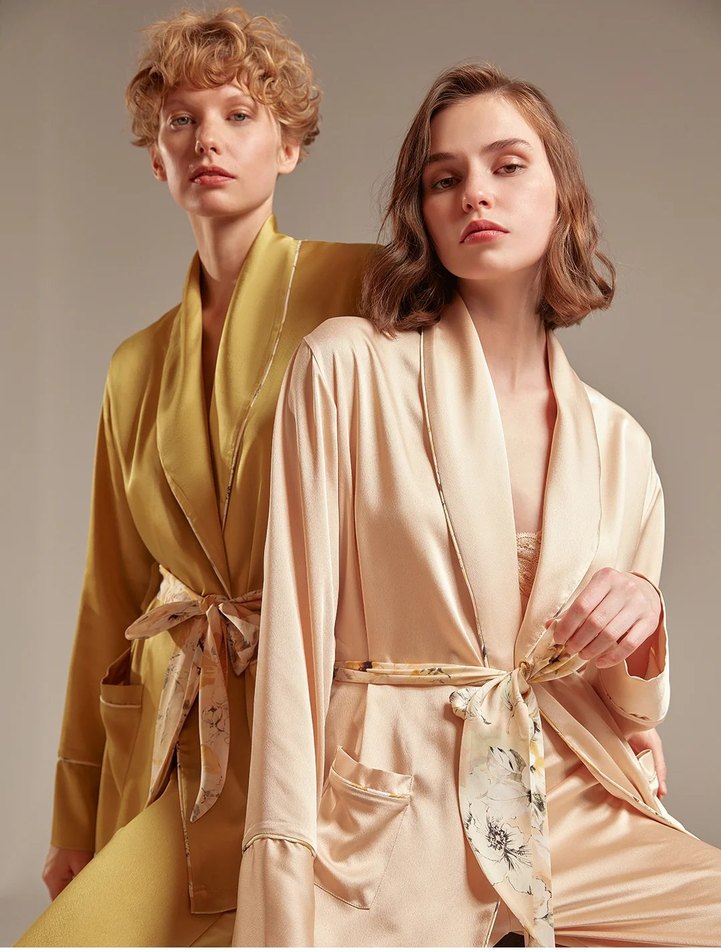 pudra renkte, modern klasik tarzda, dantelli ve desen içermeyen sütyen, zarif ve çekici bir sabahlık ve pantalon ile güzel bir görünüm sunar.