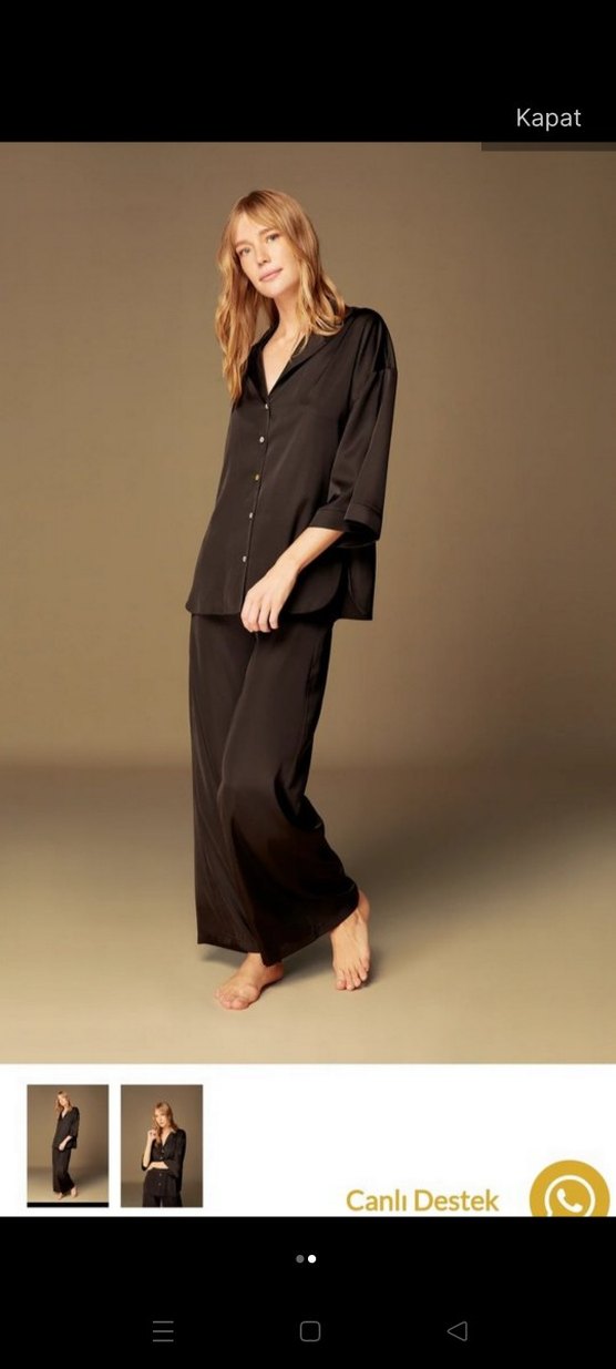 Salaş kesim, uzun kollu ve uzun boy siyah kadın pijama takımı. Minimalist ve çağdaş tarzda, desensiz ve rahat kullanım için uygundur.