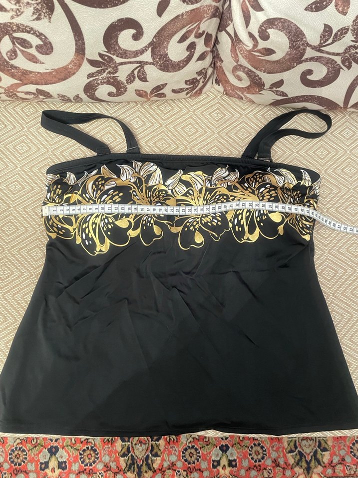 Hiç giyinilmemiş, önü gold yaldızlı çiçek baskılı, askıları çıkarılabilen, günlük hayatta da kullanılabilecek şıklıkta, tankini üst… #bonprix #tankini #mayokini #mayo #bikini