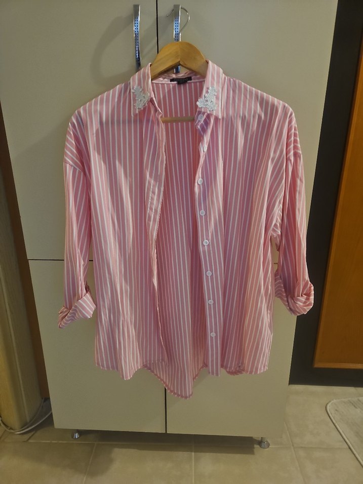 Pembe beyaz çizgili pamuklu gömlek, düğmeli yakalı ve uzun kolludur. oversize geniş kesim ve normal boy..1 kez giydim sol arka etek kısmın da lekesi vardı ..küpürlerle süsleyerek aplike yaptırdım..başka sorunu yok