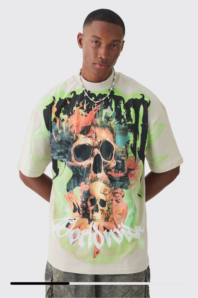 Erkek tişörtü, pamuk kumaştan, kısa kollu ve bisiklet yaka. Çok renkli bağlama desenli ve baskılı kafatası alev grafiklerine sahip, salaş kesim. Günlük kullanım için uygun.