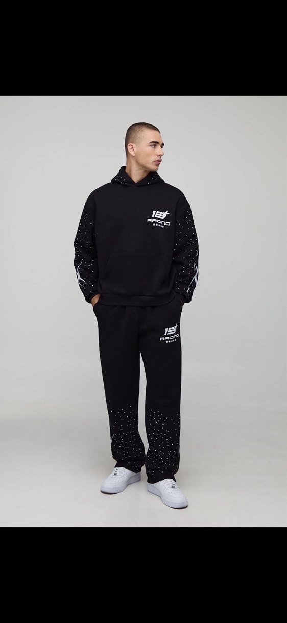 Siyah, payet detaylı, bol kesim erkek eşofman altı, yumuşak ve sıcak kumaştan. Günlük kullanıma uygun.