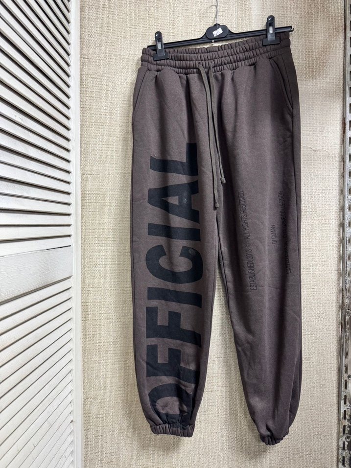 Kahverengi, bol kesim, nakış detaylı ve lastikli bel bandına sahip, günlük kullanıma uygun rahat eşofman altı.defosu vardır görsellere bakabilirsiniz