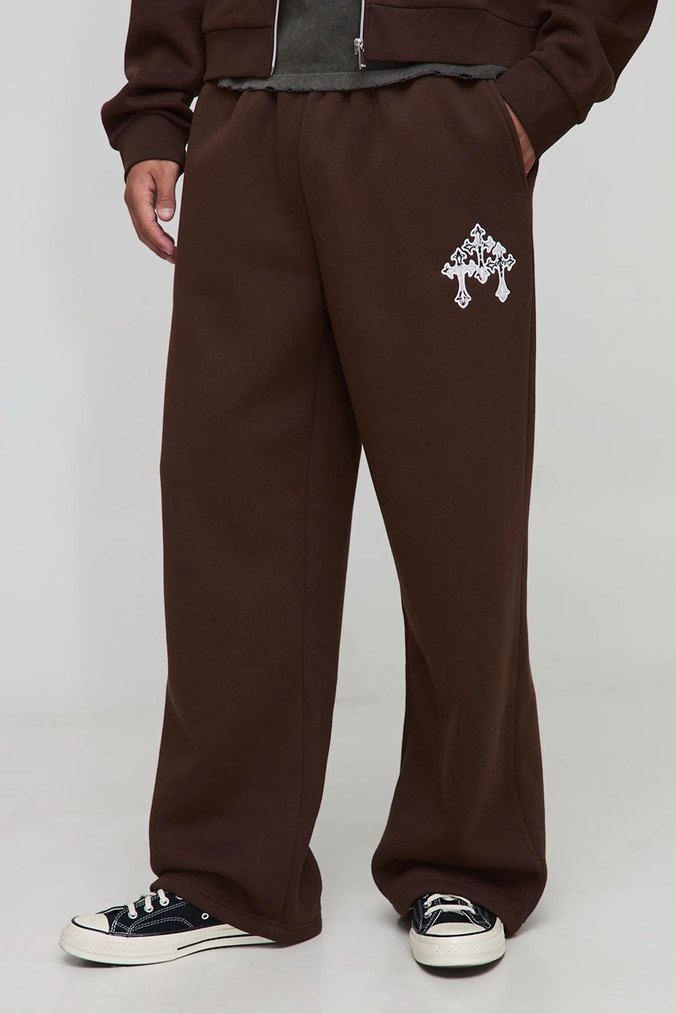 BoohooMAN rahat kesim, normal boyda, nakış detaylı, yumuşak ve sıcak kumaştan kahverengi eşofman altı.