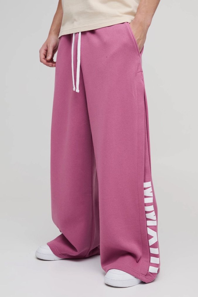 Yumuşak kumaştan, bol kesim pembe eşofman altı. Beyaz yan baskı ile günlük rahat ve şık sokak tarzı sunar.