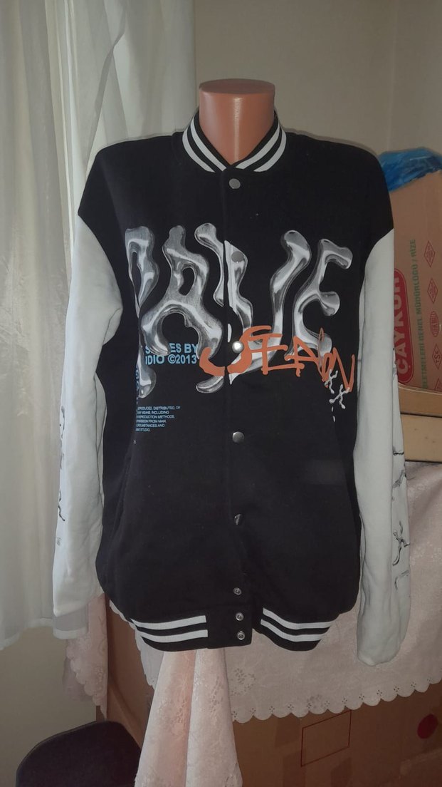 Gevşek kesim, uzun kollu, düğmeli ve baskılı kadın ceketi. Yuvarlak yakalı, sentetik kumaş, günlük kullanım için uygundur.