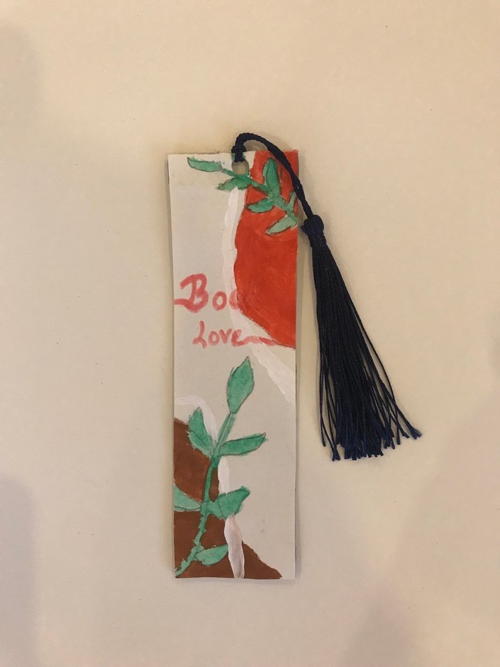 Yeşil yapraklar ve 'Bood love' yazılı renkli soyut tasarımlı sanat kitap ayracı, lacivert püskülle tamamlanmıştır.