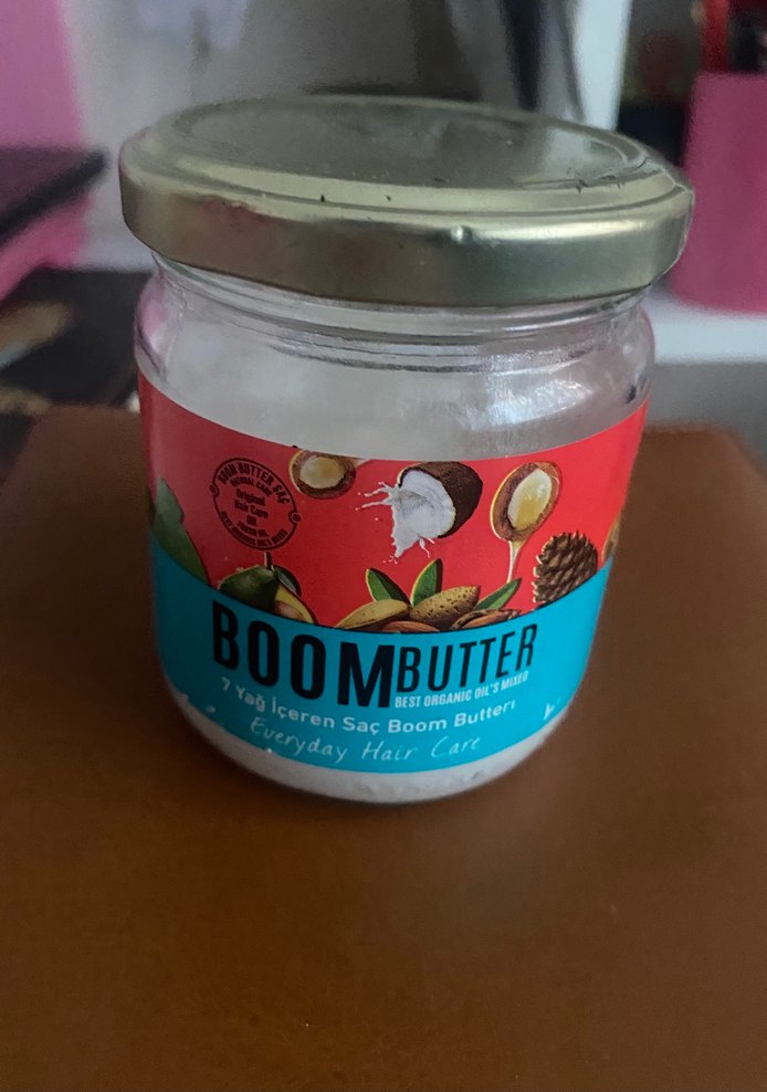 7 yağ içeren Boom Butter saç bakım balmı, saçları beslemek için cam kavanozda sunulmuştur.