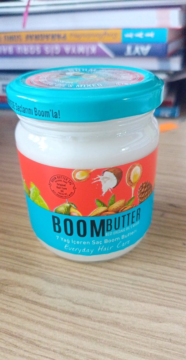 7 yağ içeren Boom Butter saç kremi, günlük saç bakımı için uygundur. Turkuaz kapaklı kavanozda, doğal içeriklerle hazırlanmıştır. hic kullanilmadi