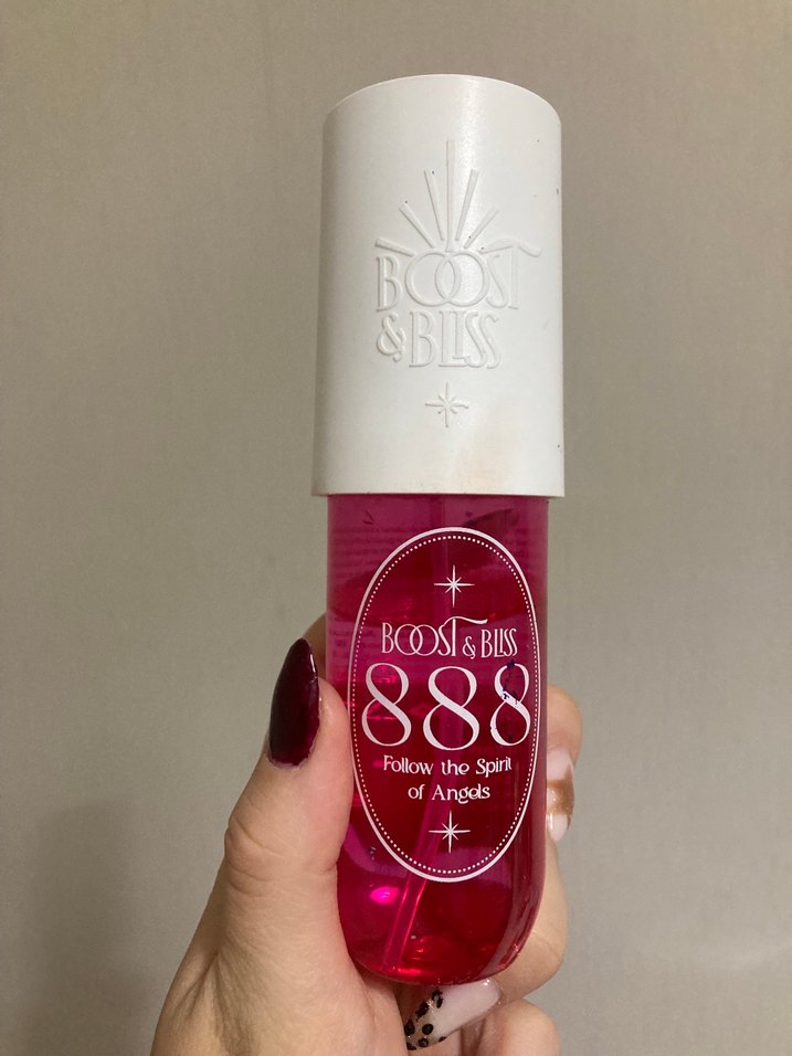 Boost & Bliss 888 kadın parfümü, beyaz kapaklı canlı pembe şişede, ferah ve canlandırıcı bir koku sunar. ✨