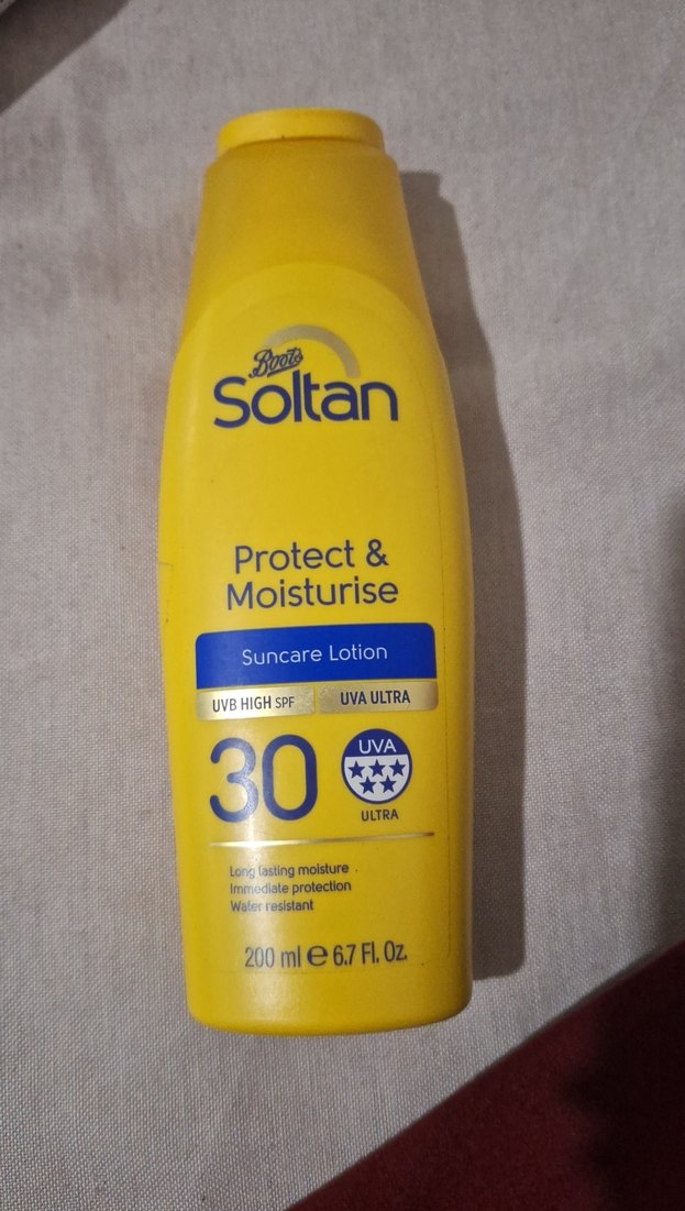 Boots Soltan Protect & Moisturise güneş losyonu SPF 30 koruma ve UVA ultra savunma sağlar. Uzun süre nemlendirir, anında koruma ve suya dayanıklıdır. 200 ml şişede.