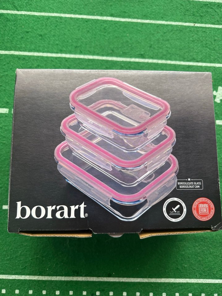 3lü #cam #saklamakabı Borart markasına ait pembe contalı cam saklama kapları seti. Üç farklı boyutta, hava geçirmez kapaklı, dayanıklı tasarım. Herhangi bir deformasyon yoktur kullanılmadı #iadeyok