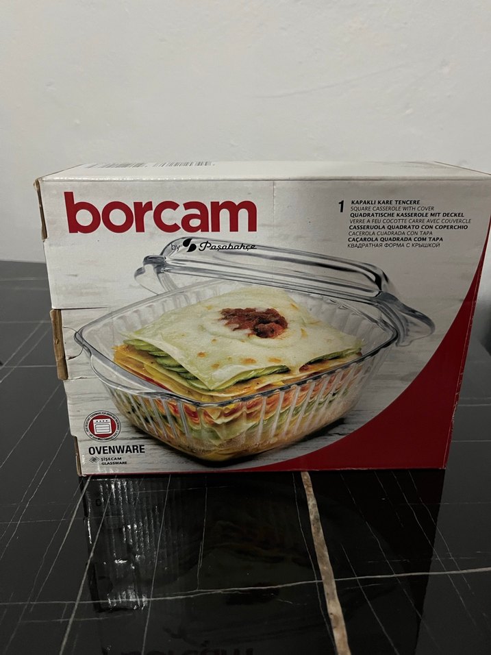 Ürün hiç kullanılmadı görselde ölçüleri mevcuttur Borcam kapaklı kare cam fırın kabı, fırında kullanım için uygundur. Şeffaf, hafif malzemeden yapılmıştır, pişirme ve servis için idealdir.