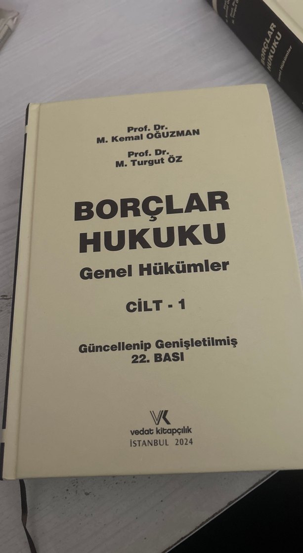 Prof. Dr. M. Kemal Oğuzman ve Prof. Dr. M. Turgut Öz imzalı, 2024 İstanbul basımı, güncellenip genişletilmiş 22. baskı Borçlar Hukuku Genel Hükümler Cilt 1 kitabı. Kitabın ilk sayfalarından çok az kısmının altı çizilidir nerdeyse tamamı temiz kitapdır.