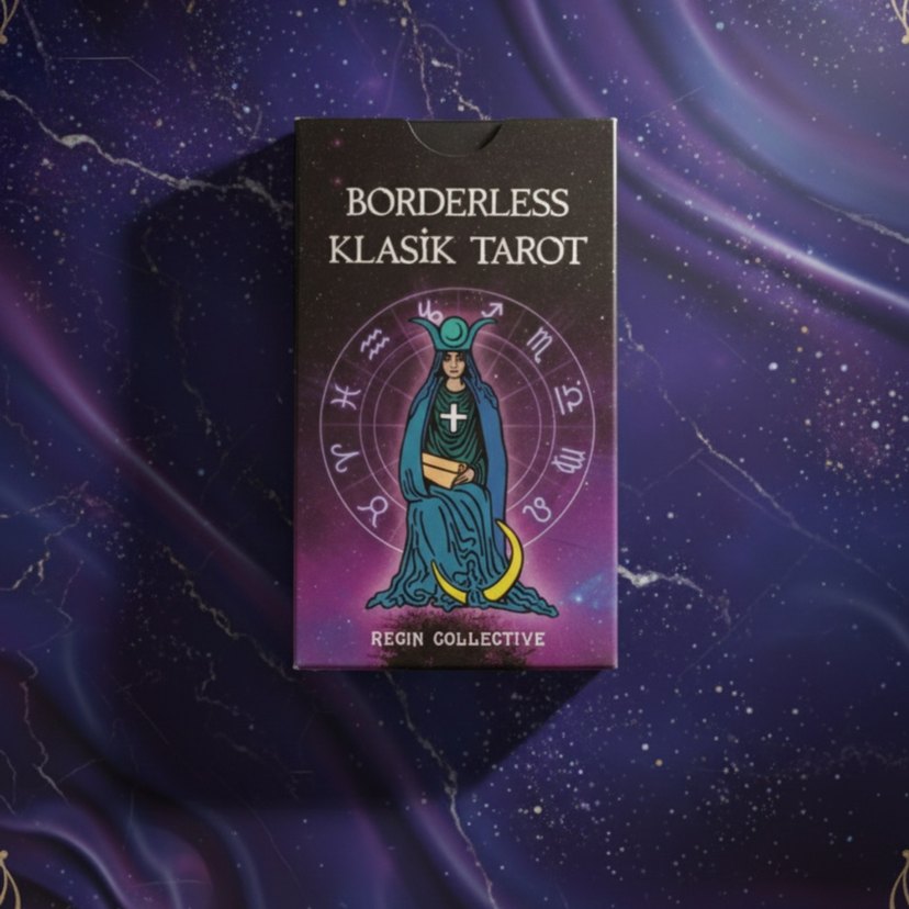 Borderless Klasik Tarot kart destesi, Regin Collective tarafından tasarlanmış klasik tarot sembolleri ve burç işaretleriyle detaylı çizimlere sahiptir.