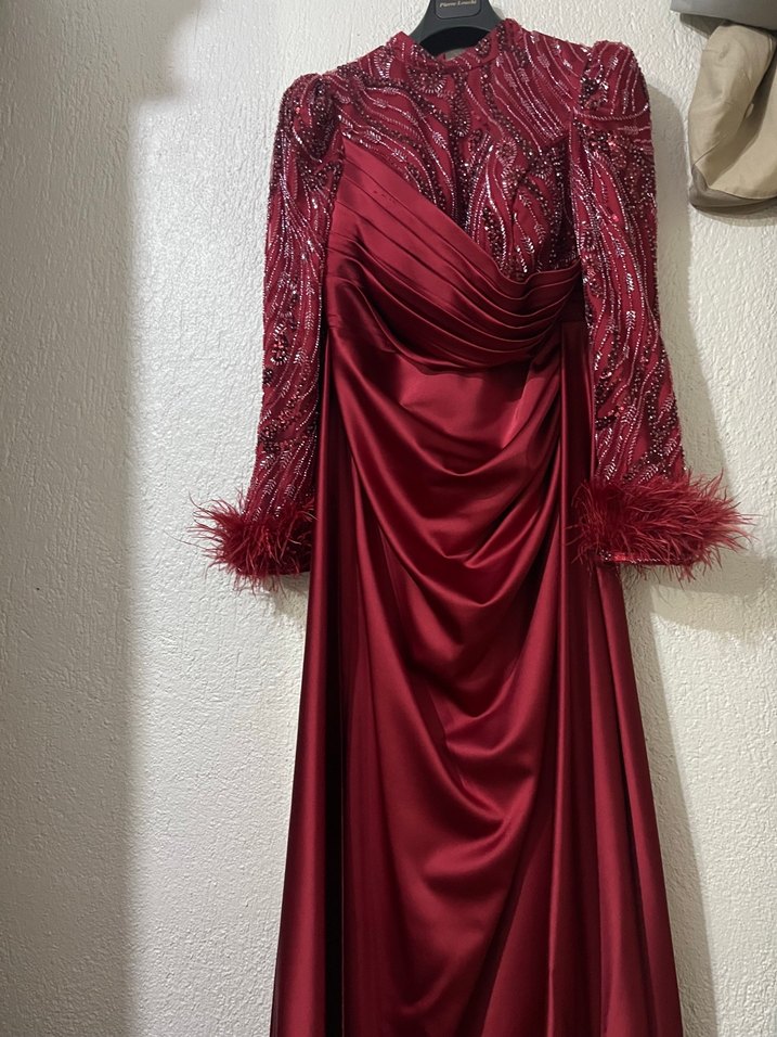 Bordo renkli, yüksek yakalı, uzun kollu ve tüy detaylı bu abiye elbise, drapeli ve parlak desenli kumaşıyla düğünler için uygun şık bir tercihtir. ✨