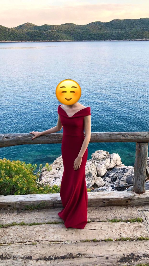 V yaka, drapeli ve parlak kırmızı renkte uzun, dar kesim kadın abiye elbisesi. İnce askılı ve minimalist tarzda, düğünler için uygun.