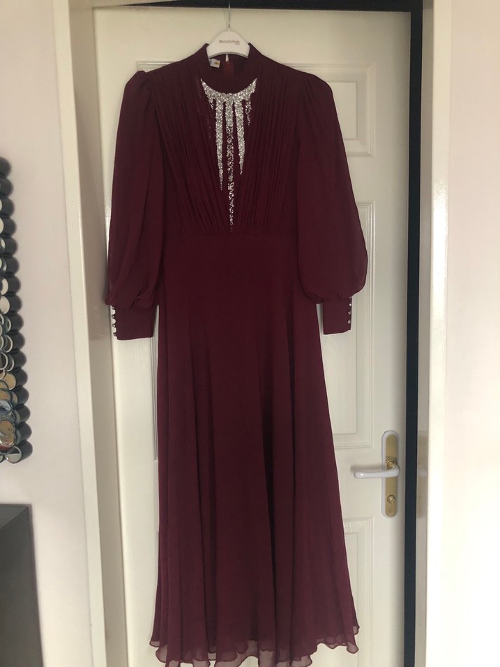 Bordo renkli, yüksek yakalı ve uzun kollu, bol kesim vintage uzun elbise. İpek gibi kumaştan, drapeli ve nakışlı detaylara sahip, klasik ve gotik tarz için uygun. Boy 140 bel 40 gmgüs esnek 50 cm ye kadar olur kol. 60 cm bir defa giyildi tertemiz ürün