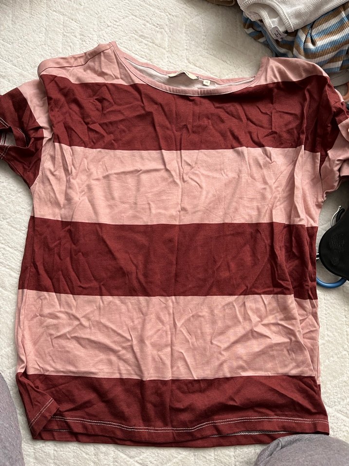 Kısa kollu, salaş kesim hamile tişörtü. Bordo ve açık pembe geniş çizgilerle, günlük rahat kullanım için yumuşak kumaştan üretilmiştir.