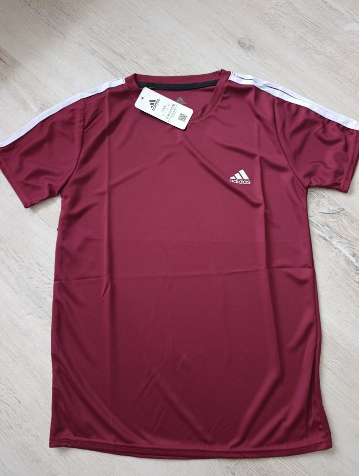 Bordo renkli Adidas erkek tişörtü, kısa kollu ve yuvarlak yakalıdır. Sentetik kumaştan yapılmış, rahat ve spor bir görünüme sahiptir. Omuzlarda beyaz şerit detayları bulunur. ♂️