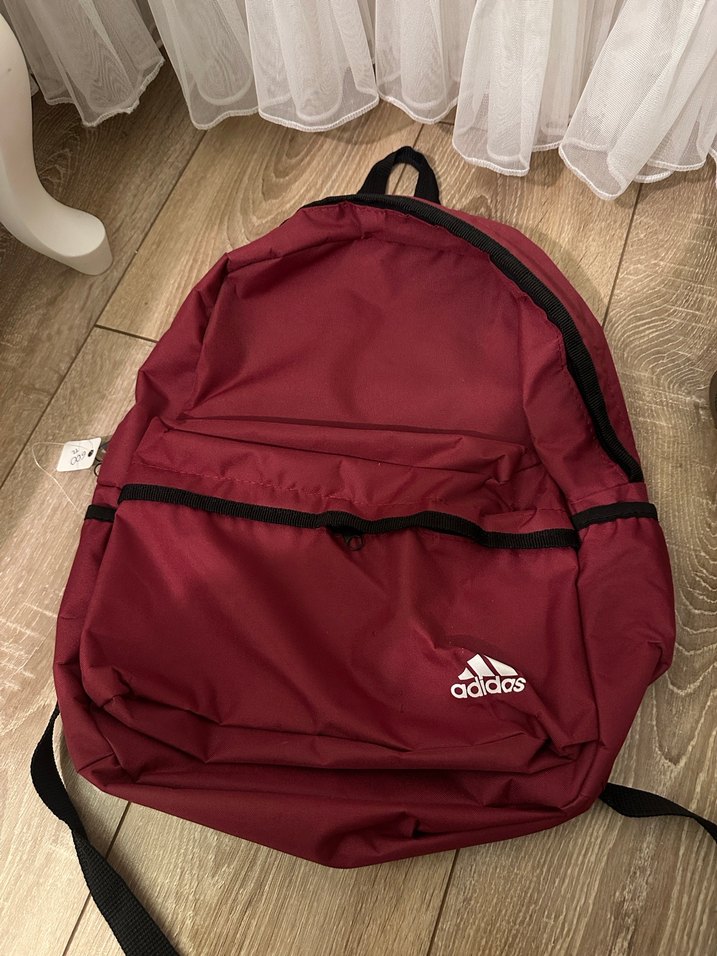 Bordo renkli Adidas sırt çantası, fermuarlı ana bölme ve ön cep içerir. Dayanıklı sentetik kumaştan yapılmıştır, spor ve günlük kullanım için uygundur.